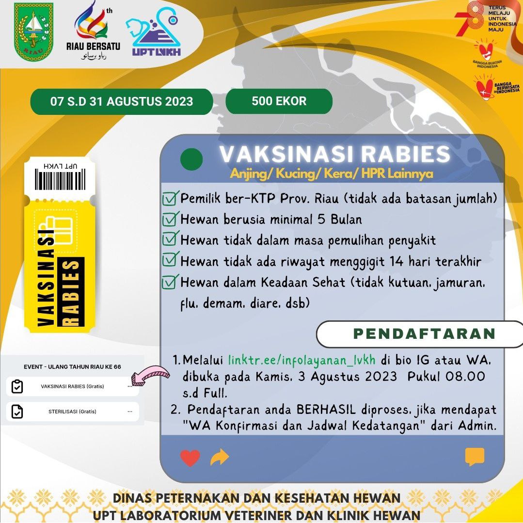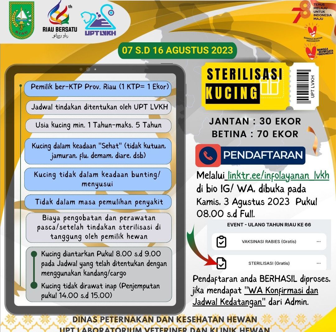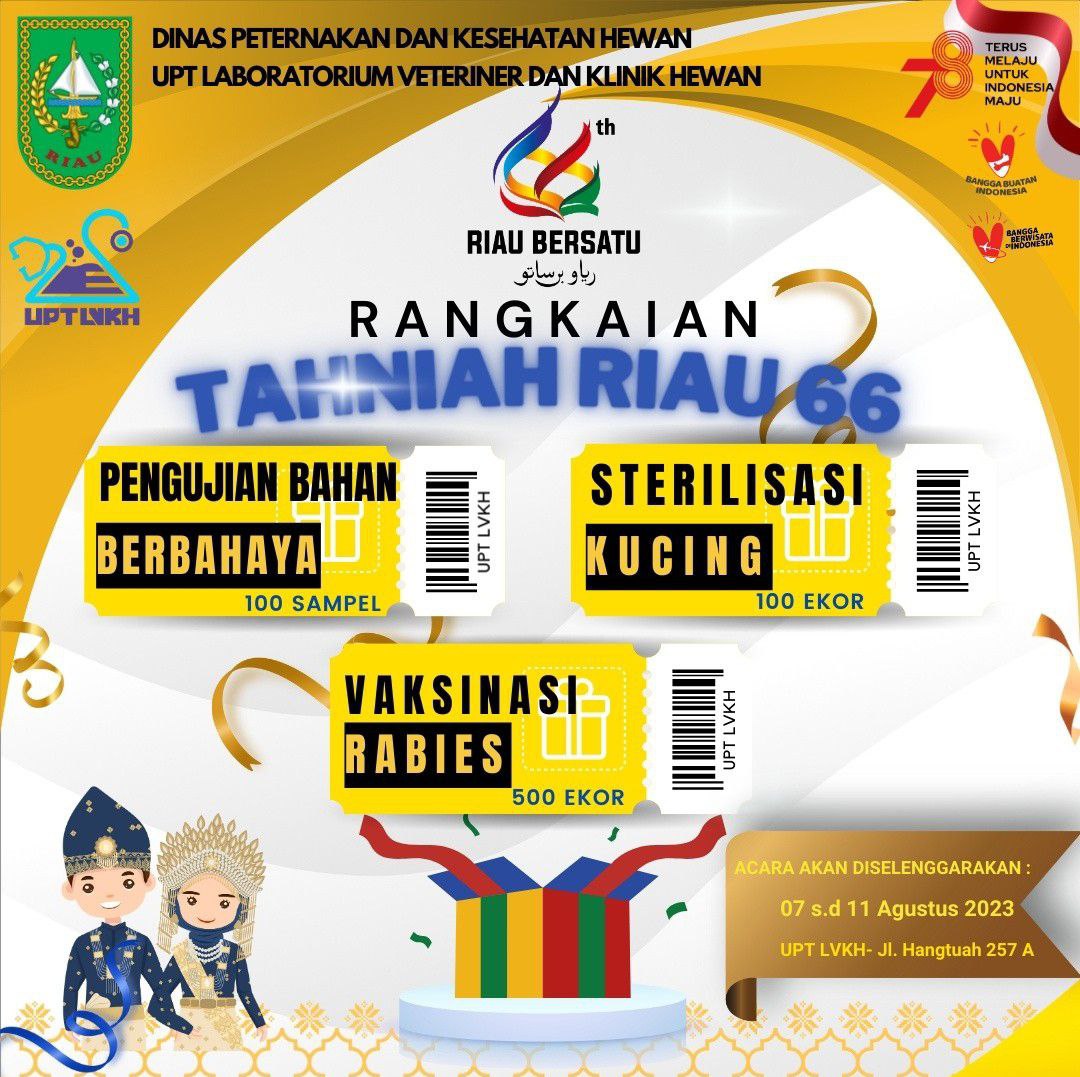 Dalam rangka memeriahkan acara Tahniah Provinsi Riau ke 66, Dinas Peternakan dan Kesehatan Hewan Provinsi Riau melalui UPT Laboratorium Veteriner dan Klinik Hewan (LVKH) menyelenggarakan rangkaian acara (GRATIS) sebagai berikut: